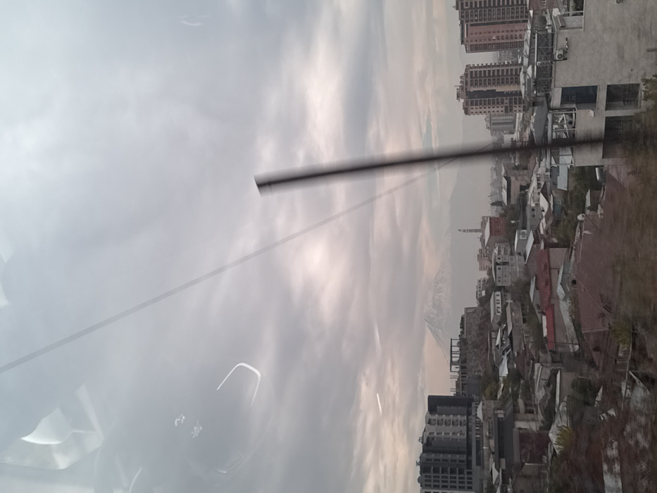 The image depicts a panoramic urban landscape of Yerevan, Armenia, viewed from an elevated position. In the background, the snow-capped peak of Mount Ararat is visible beneath an overcast, grey sky. The midground features a dense mixture of residential architecture, including several modern, multi-story apartment buildings on the left and far right, one of which appears to be under construction with exposed concrete framework. Between these newer structures, numerous older, lower-rise residential houses with various roof types (e.g., red tile, metallic, flat) are clustered. A tall, slender, dark structure, possibly a minaret or communication tower, rises in the distant mid-right. The foreground includes reflections on a glass surface, likely a vehicle window, showing faint contours of interior elements in the upper-left quadrant. A heavily motion-blurred, dark, vertical linear object (possibly a pillar or window frame) partially obstructs the view on the right, and a thin, dark, diagonal line (likely a wire or power line) crosses the upper-center. No individuals, explicit actions, or interactions are discernible.