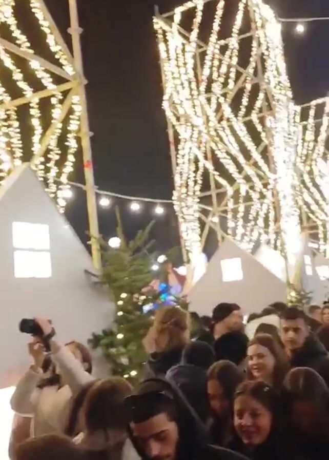 nighttime scene of a crowded outdoor area, possibly a Christmas market or festival. Tall, geometric light structures adorned with strings of warm white lights dominate the view. In the foreground, there are small, white, house-shaped structures with lighted windows, decorated with small Christmas trees. A large crowd of people, dressed in a variety of winter clothing, are walking through the area. A screen in the background displays an image. There are strings of warm white lights strung across the area above the crowd. The buildings in the background are lit up.