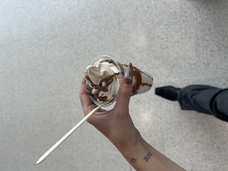 A first-person overhead perspective captures a left hand holding a clear plastic cup of soft-serve ice cream
