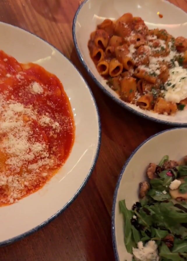 table setting with Italian food. On the table, there are three plates: one with ravioli in red sauce, one with rigatoni in red sauce, and one with a green salad with what appears to be nuts and cheese. There is also a glass of water, a wine glass, and cutlery. The table has a wooden finish.