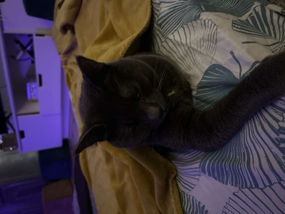 A gray cat sleeps peacefully on a bed covered with a blue and white patterned sheet. The cat's head rests on a yellow blanket or towel. Its eyes are closed, and its body is curled up. A leg extends along the top of the sheet. To the left, out of focus, is a white shelf unit with purple lighting. The overall scene has a calm and cozy atmosphere.