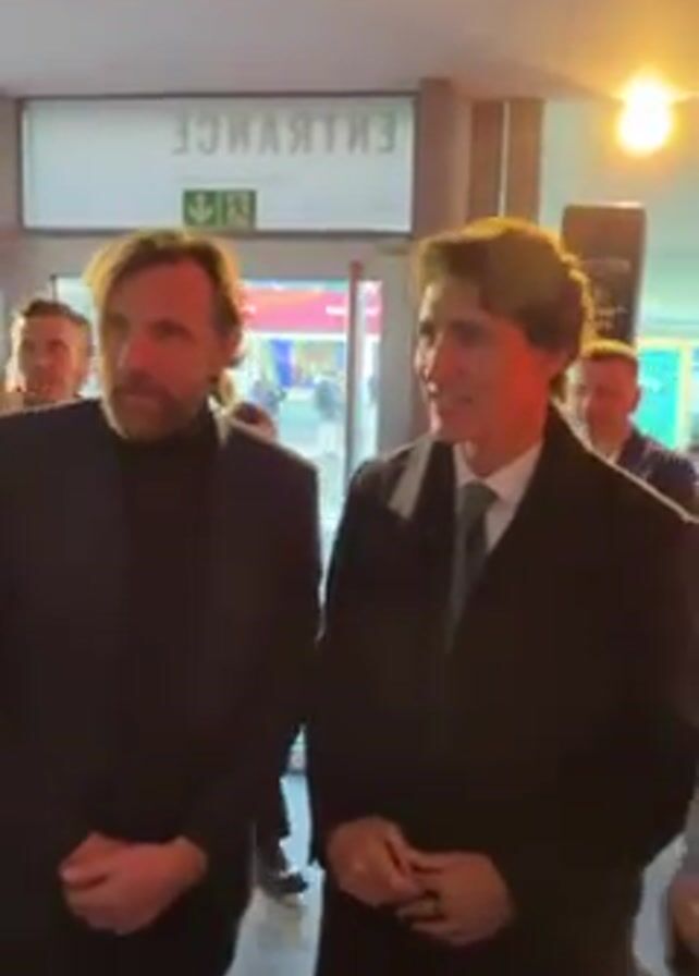 Two men in jackets stand facing forward in what appears to be a doorway. The man on the right, Justin Trudeau, briefly touches his face with his right hand. The doorway behind them leads to an area with a red and blue store front. Another man in a suit stands behind the two, and another man is partially visible behind him. An illuminated sign reading "ENTRANCE" is visible on the wall above the doorway.