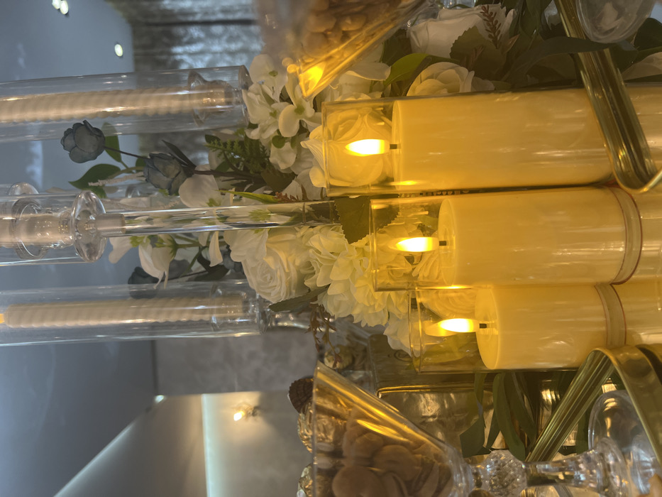 A decorative centerpiece features clear glass candlesticks holding white candles, arranged among artificial white roses and greenery