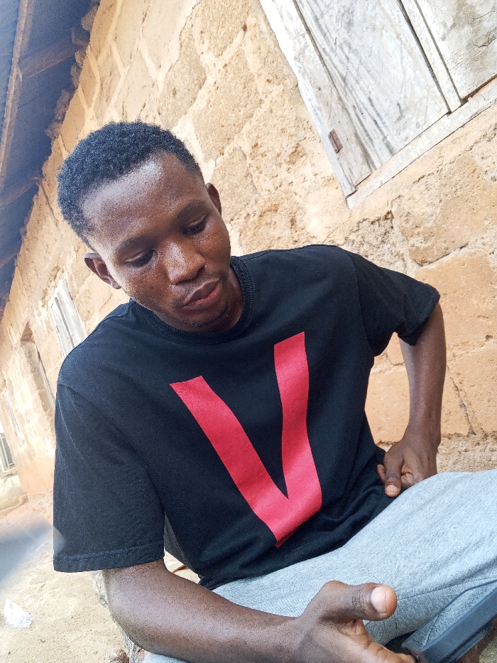 An adult male is depicted seated or crouched outdoors against a building wall in Akwanga, Nigeria. The man, with dark skin and short, dark hair, wears a black short-sleeved t-shirt featuring a prominent red 'V' design on the chest and light grey casual trousers. His gaze is directed downwards and slightly to his right. His left hand, with fingers curled, is visible in the lower foreground, while his right hand rests near his lap. The background consists of a wall constructed from light brown, rough-cut stone or brickwork. To the upper right, a weathered wooden window shutter is closed within a window frame. An overhead roof structure, dark in color, extends across the upper left portion of the image, with a glimpse of another smaller window opening to the left of the subject. Natural light illuminates the scene.