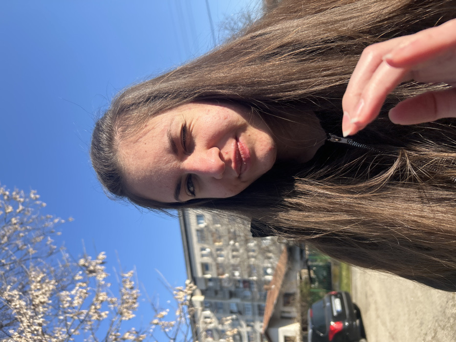 A daytime outdoor portrait photograph depicts a young female subject winking at the camera in a residential area of Cherven Bryag, Bulgaria. The subject, positioned centrally and occupying the majority of the frame, has long, straight, dark brown hair and is winking her right eye (viewer's left) while her left eye remains open. She exhibits a slight smirk or smile. Observable skin imperfections are present on her cheeks and forehead. She is attired in a dark, zippered jacket. Her right hand (viewer's left) is partially visible in the lower right foreground, raised with fingers slightly spread. The background features a clear, bright blue sky. In the mid-ground, a multi-story, light-toned apartment building with multiple windows is visible behind the subject's left shoulder. Below this, a single-story house with an orange-brown tiled roof is present. Bare tree branches with light-colored buds or nascent leaves extend into the upper left quadrant. A dark-colored SUV or hatchback vehicle is parked on a paved surface in the lower left, its rear facing the camera. Faint utility lines are visible against the sky on the right. The scene is illuminated by direct sunlight, producing shadows on the subject's face and the environment.
