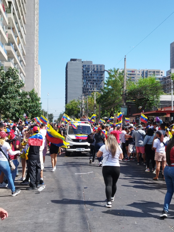 A dense crowd fills a street, predominantly waving Venezuelan flags. A white van, adorned with flags, moves slowly through the crowd. Buildings line either side of the street, with a mix of low-rise and high-rise structures. The atmosphere is bright and festive under a clear blue sky. Many people are wearing casual clothes, and the flags add pops of yellow, blue, and red to the scene.