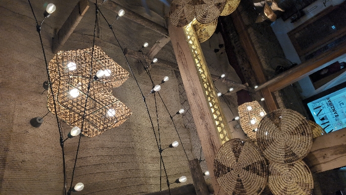 n interior space with rustic design elements. A large, woven cube-shaped light fixture hangs from the ceiling, adorned with multiple exposed bulbs. Strings of lights also accent the space. Woven baskets of various sizes are arranged on the walls. A textured wall and a decorative, illuminated column contribute to the earthy ambiance. Part of a window and signage, possibly indicating "Zanzibar", are also visible.