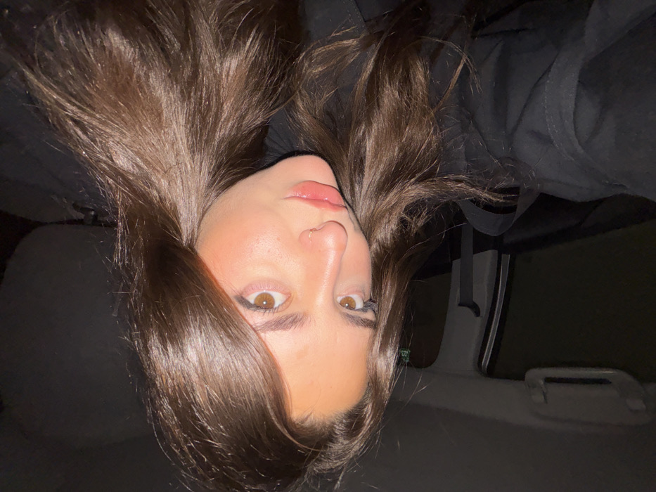 A young woman with brown hair poses in a car, face centered. Her eyes are hazel and makeup is visible. The car interior is dimly lit, with a door and handle visible to the right. Her hair is spread around her face. She is wearing a black shirt or jacket. The image is somewhat dark and grainy, and the perspective is unusual, suggesting the photo was taken from an upside-down or tilted angle.