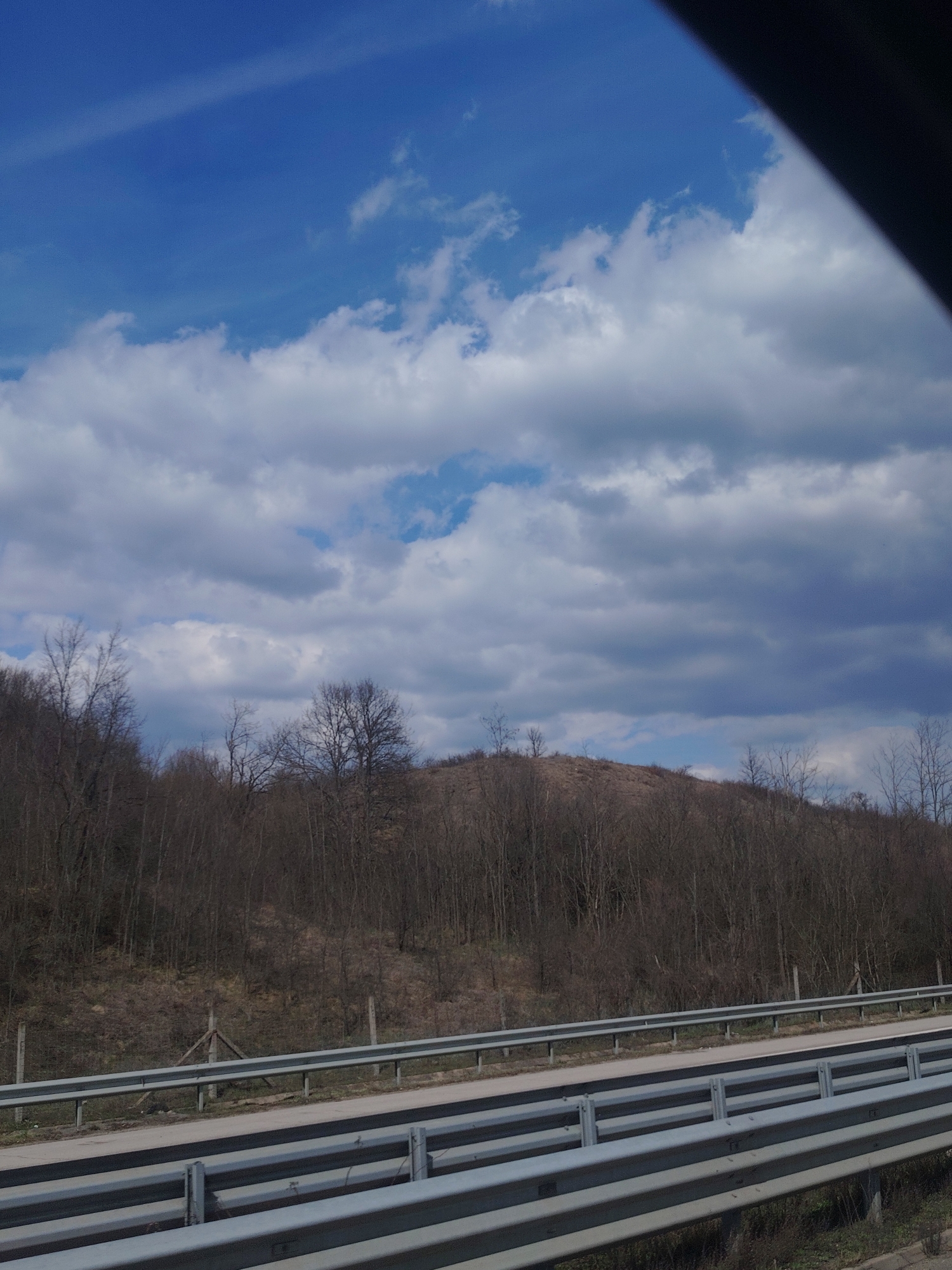 The scene depicts a rural highway landscape located in Ravnishte, Bulgaria, observed from an elevated position within a vehicle, indicated by a dark diagonal obstruction in the upper right. The sky overhead is partially cloudy, featuring patches of clear blue in the upper left, crossed by a faint white contrail. Below this, an expanse of white cumulus clouds transitions to darker grey stratocumulus clouds stretching across the horizon. The mid-ground is dominated by a dense treeline of bare deciduous trees, indicating a season without foliage, covering a gentle hillside. Beyond the treeline, the upper slope of the hill is visible, covered in sparse, dry, light brown vegetation. In the immediate foreground, a multi-tiered configuration of galvanized steel highway crash barriers (guardrails) extends diagonally across the lower portion of the frame. Behind the crash barriers, a strip of dry grass and soil is visible, followed by a wire fence with wooden posts, one of which is reinforced with a triangular wooden support structure. No individuals, discernible actions, or interactions are present in the image.