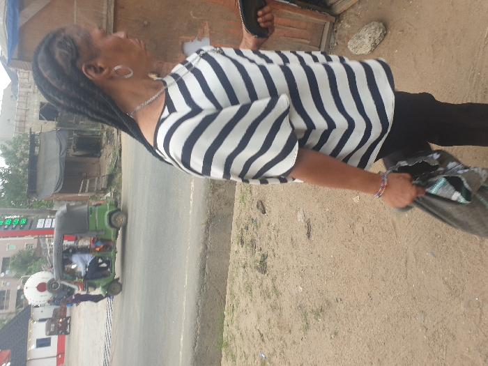 The image depicts an outdoor street scene in Umuode, Nigeria. In the foreground, a middle-aged woman is shown in right profile, walking on an uneven dirt path. She has dark braided hair styled with cornrows on the sides, wears silver hoop earrings, a silver chain necklace, a white top with wide black horizontal stripes, and dark trousers. Multiple colorful beaded bracelets are visible on her left wrist, and she carries a dark fabric item with a plaid pattern in her left hand. Her right hand holds a small dark object. A large, light-colored rock rests on the dirt path near her. In the mid-ground, a gray asphalt road separates the dirt path from the background elements. A green three-wheeled motorized vehicle, commonly known as a "keke napep," with a black canopy is in motion on the road, heading right. At least two individuals, including a driver in a light shirt, are visible inside the vehicle. A third person stands near the front left of the tricycle. The background features several structures. On the far left, a white building with a red roof and dark trim, possibly a fuel station, is partially visible. A tall pole with green illuminated signage and a white spherical object with red markings is positioned nearby. To the right, a dilapidated, single-story structure with a dark roof and unfinished or rough walls stands. Further in the distance, a multi-story building with a light-colored facade is visible under an overcast sky.