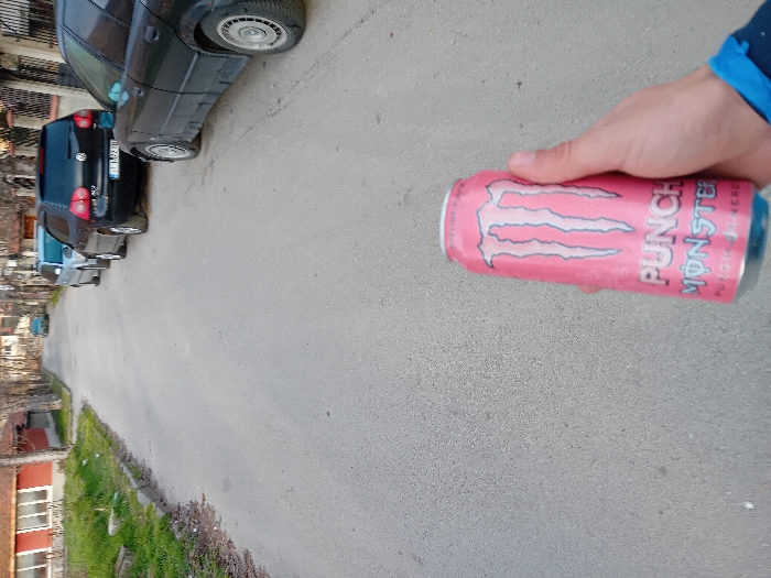 A first-person perspective image depicts a street scene in Provadia, Bulgaria. In the foreground, a light-skinned right hand grasps a pink aluminum can of "PUNCH MONSTER ENERGY," featuring a white claw mark logo and white text. A segment of blue fabric or wristwear is visible on the wrist. The street, composed of grey asphalt, extends into the background. On the right side of the street, several vehicles are parked parallel to the curb. The most prominent parked vehicle is a black Volkswagen Golf, displaying a Bulgarian license plate 'B 1629 MH'. A dark sedan is parked immediately in front of the Golf, and a light-colored van is parked further down the street. A decorative metal fence runs alongside the street on the right, with bare trees visible behind it. On the left side of the street, a narrow strip of green grass and a concrete curb separate the roadway from a residential property. A single-story building with a red-tiled roof and multiple windows is partially visible behind the trees and grass on the left. The environment suggests an overcast day, with no strong shadows present.