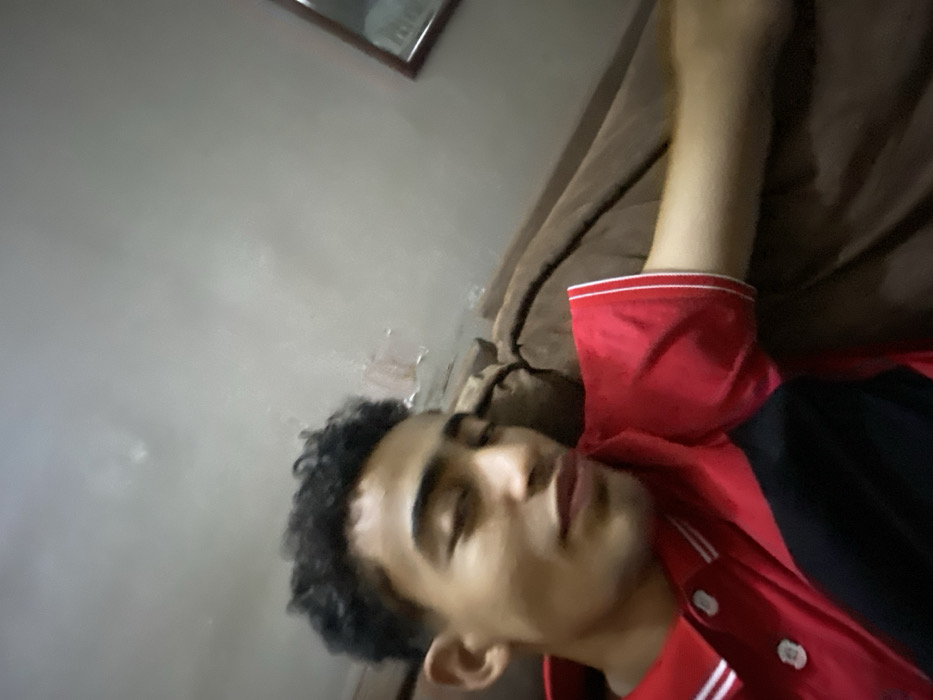 A male individual is depicted reclining on a brown upholstered couch or armchair within an indoor setting in Flor Amarillo, Venezuela. The individual possesses dark, curly hair and is wearing a red polo shirt featuring a black lower torso panel and white stripes on the collar and sleeve cuffs. His face is oriented towards the right, with eyes partially closed or downcast. The background wall is light-colored and exhibits areas of peeling paint or plaster. A dark-framed, rectangular object is partially visible on the upper right portion of the wall. The lighting in the scene is dim and diffused.