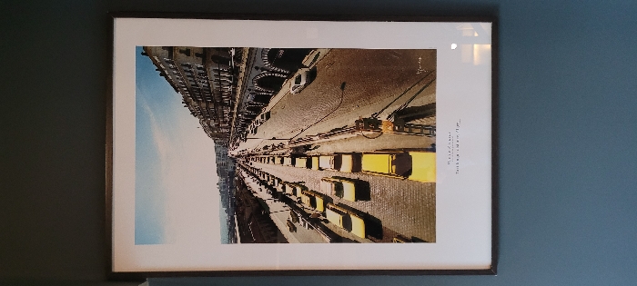 Framed, an inverted perspective photograph presents a cityscape with rows of yellow taxis lining a street