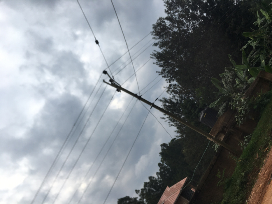 The image displays an outdoor scene in Bobaracho ward, Kenya, under a heavily overcast sky dominated by dark grey clouds. A wooden utility pole, angled slightly right of center, stands prominently, supporting multiple horizontal and diagonal power lines or communication cables with insulators. To the immediate left of the pole, a section of a building with a distinctive reddish-brown tiled roof is visible. In the midground, a dark grey cylindrical water tank is situated atop a low concrete or stone wall. Below and to the right of the wall, several large-leafed banana plants and other green vegetation are present. The lower foreground consists of reddish-brown dirt or disturbed earth, appearing as a sloping path, bordered by green grass. Dense, dark green foliage, characteristic of trees, forms a substantial backdrop across the upper right and mid-left portions of the scene. No individuals or animals are visible.