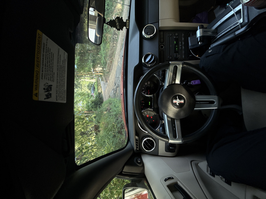 - "This image provides a first-person perspective from the driver's seat of a red Ford Mustang, positioned on a narrow, unpaved or deteriorated road in Osage Beach, United States" by FM-EQHYk2, licensed under CC BY 4.0