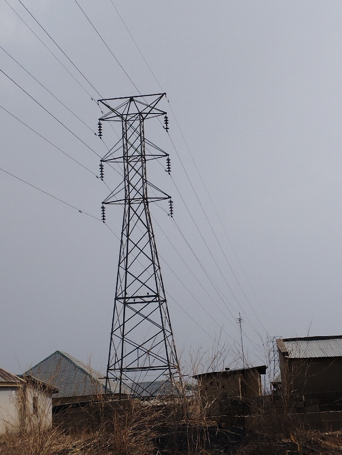 The image depicts an outdoor scene in the city of Ban, Nigeria, under an overcast, light grey sky. A dark-colored, steel lattice power transmission tower stands centrally, dominating the frame. The tower supports multiple high-voltage power lines via several sets of ceramic insulators attached to its horizontal cross-arms; these lines extend horizontally towards the right. In the immediate foreground, dry, brown, sparse vegetation, consistent with tall grass or weeds, covers uneven ground. Several single-story buildings with corrugated metal roofs are visible in the mid-ground. On the left, a light-colored building with a pitched roof is partially seen. Towards the right, multiple earth-toned structures with corrugated metal roofs, some appearing rustic or partially constructed, are present. No human or animal subjects are visible, and no discernible actions or interactions are occurring.