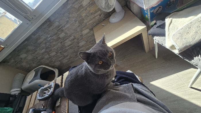 The scene, depicted as occurring in Pleven, Bulgaria, shows an indoor environment, likely a residential room, illuminated by direct natural sunlight. The central subject is a grey domestic cat with amber eyes, positioned on the lap of an individual, facing the camera with its head slightly tilted to the left. The individual's lower torso and legs are obscured, with only a dark garment (trousers or sweatpants) and a grey and white striped fabric covering their lap visible. The room features light-colored, wood-effect flooring and an upper wall section or sloped ceiling clad with textured grey-brown stone-patterned material. A white-framed window, possibly a skylight, is visible in the upper left, letting in bright light. To the left of the cat, a white and grey modern pet carrier or covered litter box is situated on a lower surface. Further left, a tall, grey fabric cylindrical object is visible. Below the cat's tail, a disassembled electronic device containing wires and metallic components rests on a wooden surface. To the right of the cat, a small, light-colored wooden side table or stool holds a white oscillating desk fan. Behind this table, a partially visible cardboard box with blue and white graphics is stacked near a chair with white legs, which is draped with a light-colored, patterned towel. Strong shadows are cast on the floor by the objects and light source.