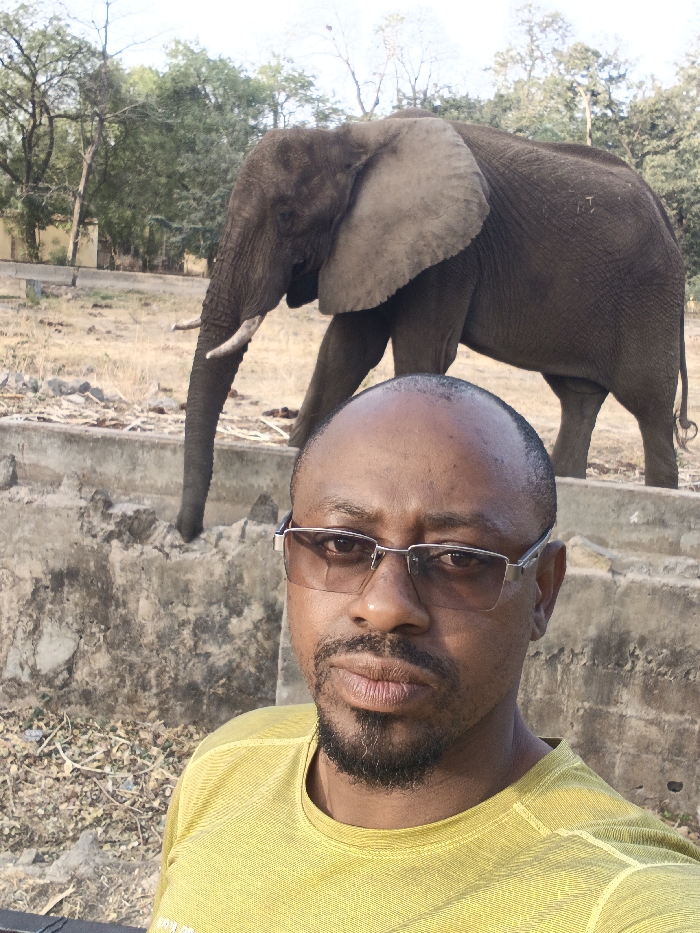 - "The image depicts a selfie-style photograph taken in Gandu Albasa, Nigeria, featuring an adult male in the foreground and an African elephant in the mid-ground" by FM-Bh3W72, licensed under CC BY 4.0