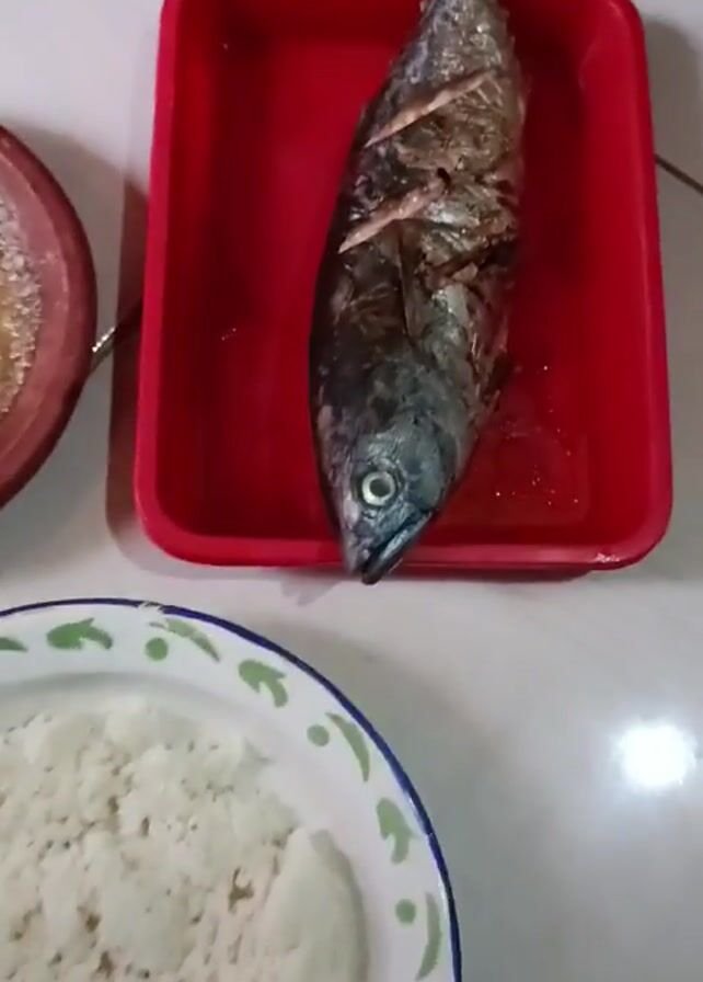 meal consisting of a grilled fish, rice, and a side dish, likely a sauce or condiment. The fish, dark gray with some browned areas, is served in a red rectangular plastic container. A plate of white rice with a blue and green patterned edge is positioned below the fish. To the left of the rice is a shallow brown ceramic dish containing a light brown, textured substance. The scene is shot from above, and the meal is placed on a white tiled surface. The focus is primarily on the fish and the meal presentation.