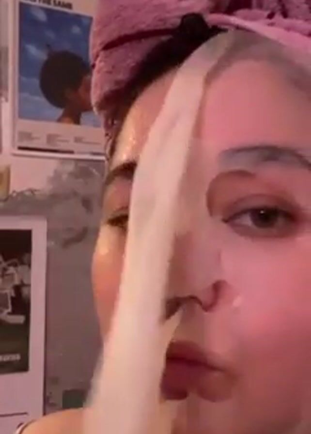 A close-up shot features a woman removing a facial mask. She is fair-skinned with visible pores and a gold nose ring. A pink striped towel is wrapped around her head. The woman is looking down as she peels the damp, semi-transparent mask off her face, revealing moist skin. In the background, a framed poster is visible with the text "NOTHING WAS THE SAME." Other items are indistinct due to the shallow depth of field.