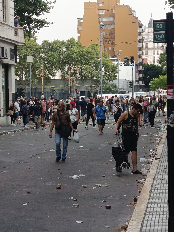 A street scene shows a crowd of people walking amongst debris