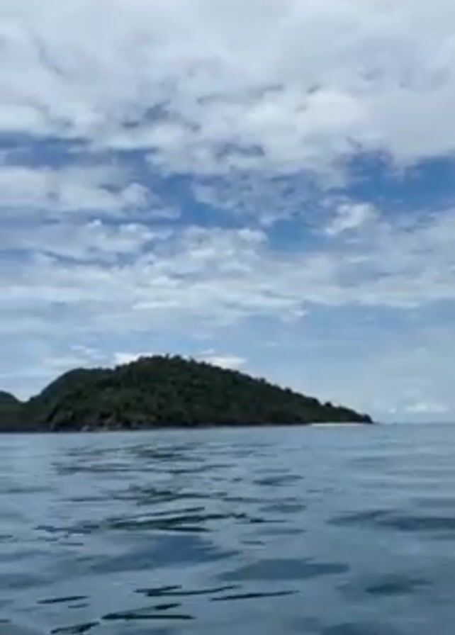A person on a boat looks out at islands across the water. The boat moves toward the island in the distance under a cloudy sky. A person with facial hair and glasses is visible in the corner of the screen. The water is choppy.