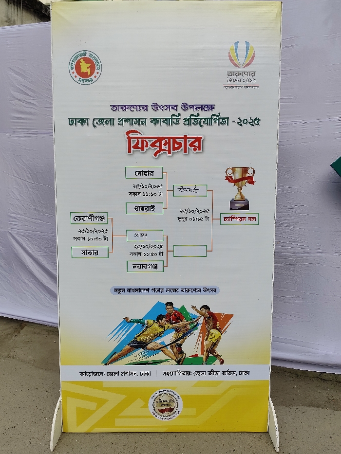 - "A vertical, free-standing banner for the "Dhaka District Administration Kabaddi Competition - 2023" is positioned outdoors in Dhaka, Bangladesh" by FM-AaaN82, licensed under CC BY 4.0