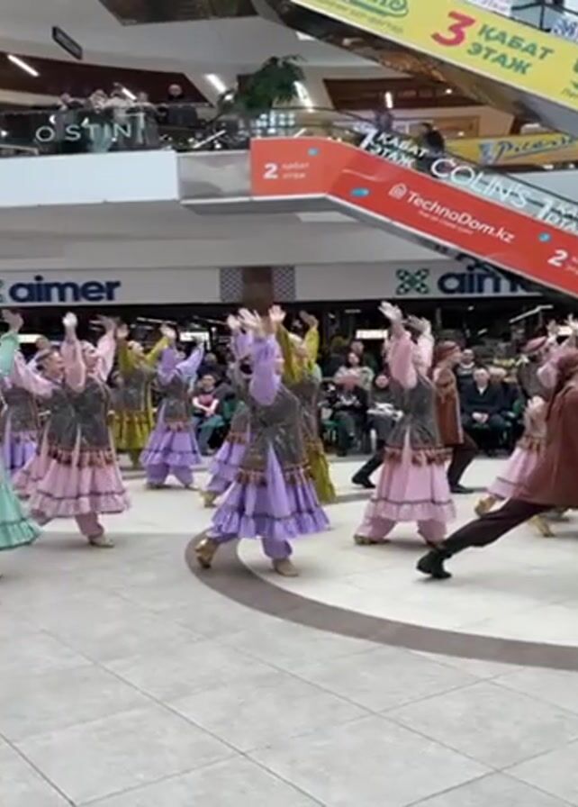 A group of dancers in traditional clothing perform a folk dance in a shopping mall