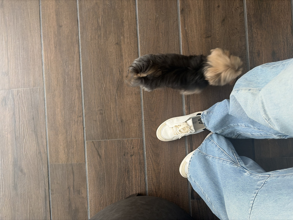 A small, long-haired, dark brown and tan dog stands on brown wood-look flooring next to a person wearing light blue jeans and off-white sneakers. The person's legs are slightly apart. The dog appears to be looking away from the person. A dark object, possibly furniture, is visible near the bottom of the frame. The lighting is bright, and the view is from overhead.