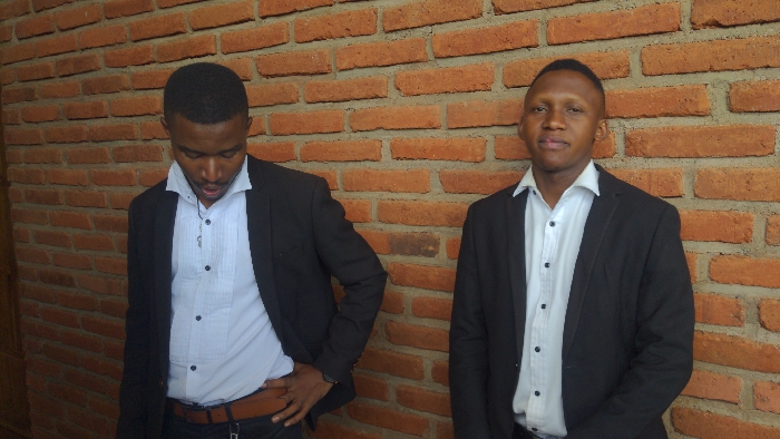 Two young men stand in front of a brick wall. Both wear white shirts, black blazers, and dark pants. The man on the left looks down with his left hand on his hip, a brown belt visible. The man on the right looks directly at the viewer. The background brick wall is a mix of orange and brown hues.