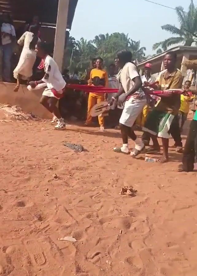 traditional game taking place on a red dirt ground with spectators nearby. Two teams of men are engaged in a tug-of-war, using a thick red rope. The men are dressed in casual clothing and some are holding disc-like objects. A woman in a white dress dances near the edge of a raised platform, where other people are standing and watching. The setting appears to be outdoors, with a building under construction in the background and trees visible in the distance. The game involves some physical contact between the participants.