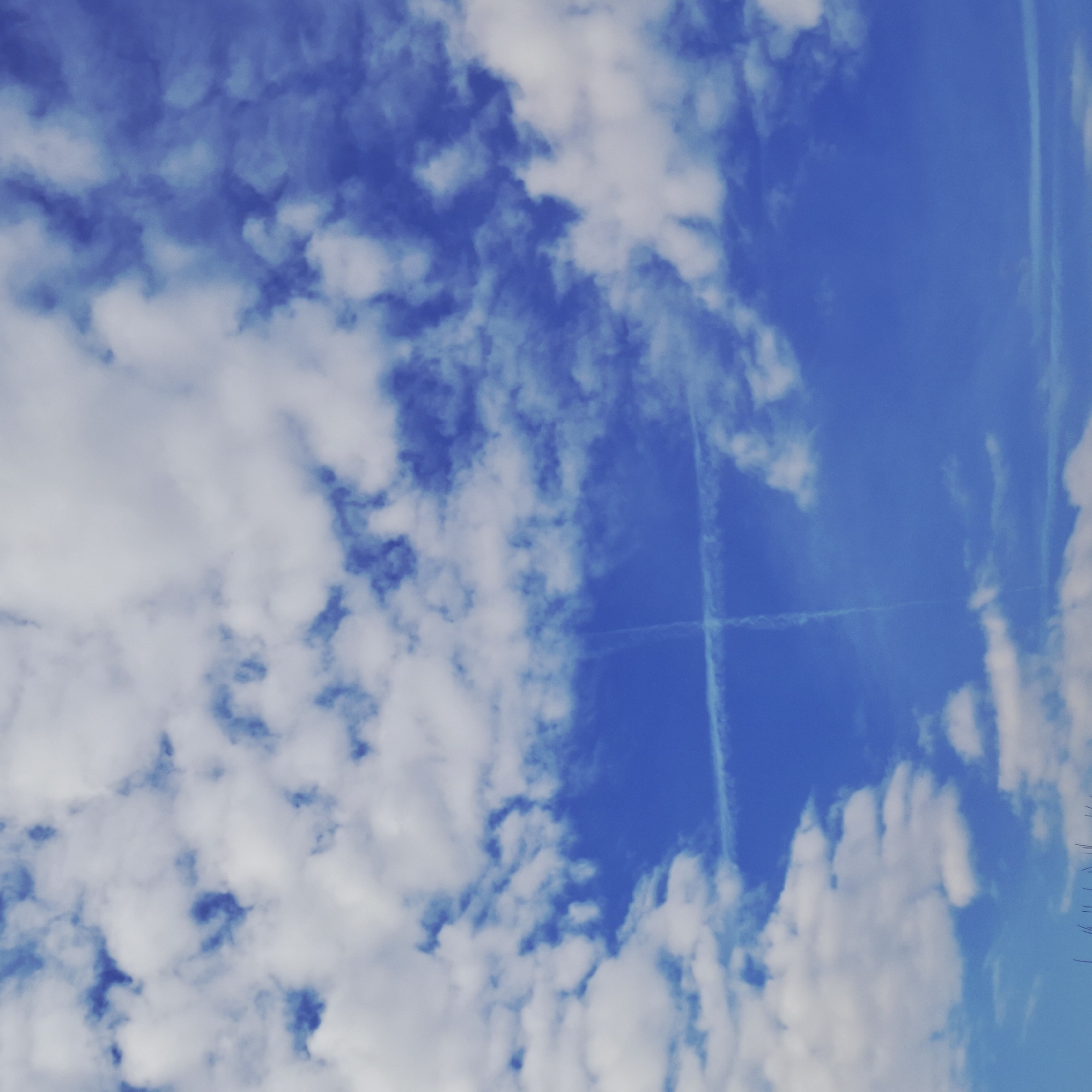 The image displays a bright blue sky above Plovdiv, Bulgaria, with numerous scattered white cumulus clouds occupying approximately 50% of the frame. Two distinct airplane contrails intersect in the upper-central area, forming a clear 'X' pattern. A third, fainter linear contrail is present horizontally in the lower-right section. No ground features, structures, or individuals are visible within the scene. The overall environment is an open sky on what appears to be a clear to partly cloudy day.