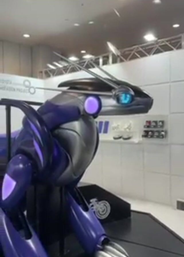 A robot, designed to resemble the Pokémon Miraidon, is on display at an event. The robot is primarily purple and gray with a sleek, futuristic design. It has a central purple orb and blue, glowing eyes. The robot is presented on a black platform, situated in front of a white wall. A Pokémon logo and the words "TOYOTA ENGINEERING MIRADON PROJECT" are on the wall behind the robot. The setting appears to be an indoor exhibition or convention space.