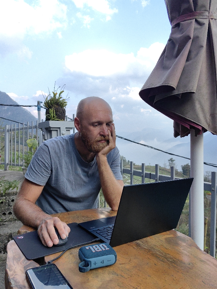 A bald, bearded male individual, dressed in a grey t-shirt, is seated outdoors at a rustic wooden table. His right hand supports his chin, with his right elbow resting on the table, while he gazes downward at a black laptop with a dark screen. His left hand operates a wired black computer mouse on a black mousepad featuring a stylized red logo. A teal blue JBL portable speaker and a dark-colored smartphone are also present on the table. Behind him, a white metal and concrete railing extends horizontally. To the left, a potted plant with green foliage is placed on a concrete pillar. To the right, a collapsed beige patio umbrella is partially visible. The background displays a multi-layered mountainous landscape partially obscured by atmospheric haze, beneath a clear blue sky with scattered white clouds. The scene is situated in the city of Tả Van, Vietnam.