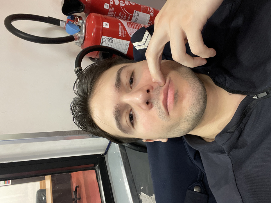 A male individual with dark hair, light skin, and light stubble on his face is depicted in a close-up, eye-level indoor shot. He is looking directly at the camera. His right index finger is pressed against the philtrum area above his upper lip. He wears a dark blue quarter-zip top with a silver-colored chevron insignia visible on his left shoulder. To the left, a window or glass partition reveals a red-floored room with a dark office chair and a desk. To the right, a plain light-colored wall features two red fire extinguishers. One fire extinguisher is prominently displayed with a black hose, a blue valve cap, and a label indicating "EXTINCTEUR" and a date of "2021." The scene suggests an indoor institutional or commercial setting within the city of Unknown, Unknown.