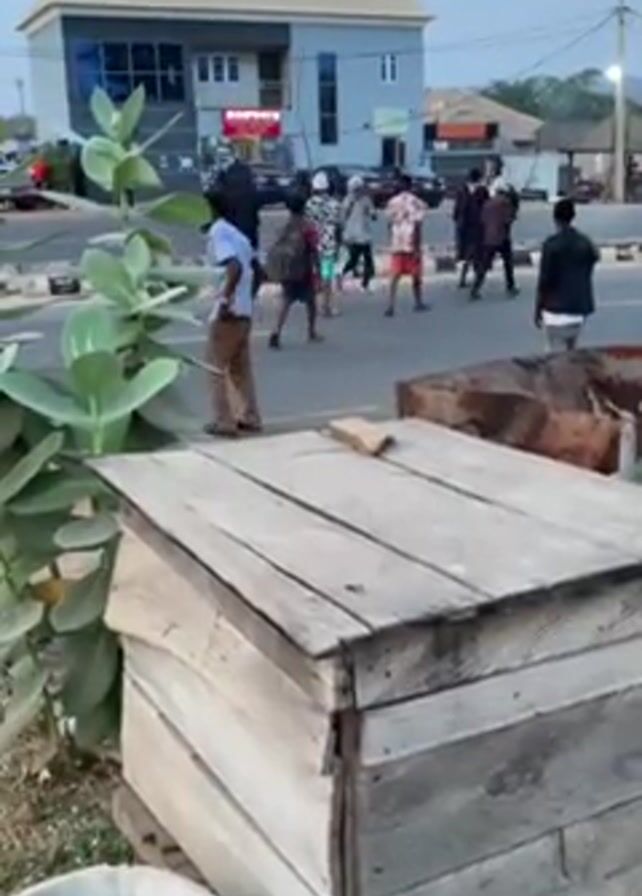 In the outdoor scene, a group of about fifteen individuals, mainly dressed in casual clothing such as shorts, patterned shirts, and a few in jackets, are scattered across a two-lane road, apparently blocking traffic. A gray Toyota Camry is briefly visible moving through the scene. In the foreground, a weathered, wooden structure that appears to be a container or box sits next to some green foliage and rusty metal debris. In the background, there is a two-story building painted gray with white trim. A red storefront sign and lettering is partially visible on the building. A street light is also visible. The sky is overcast, and the overall lighting suggests it is late afternoon or early evening.