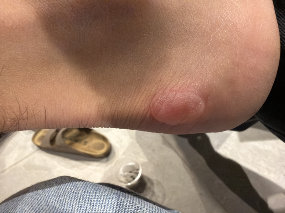 A close-up, downward-angle photograph captures a human right heel in Givat Shmuel, Israel, prominently displaying a large, fluid-filled blister