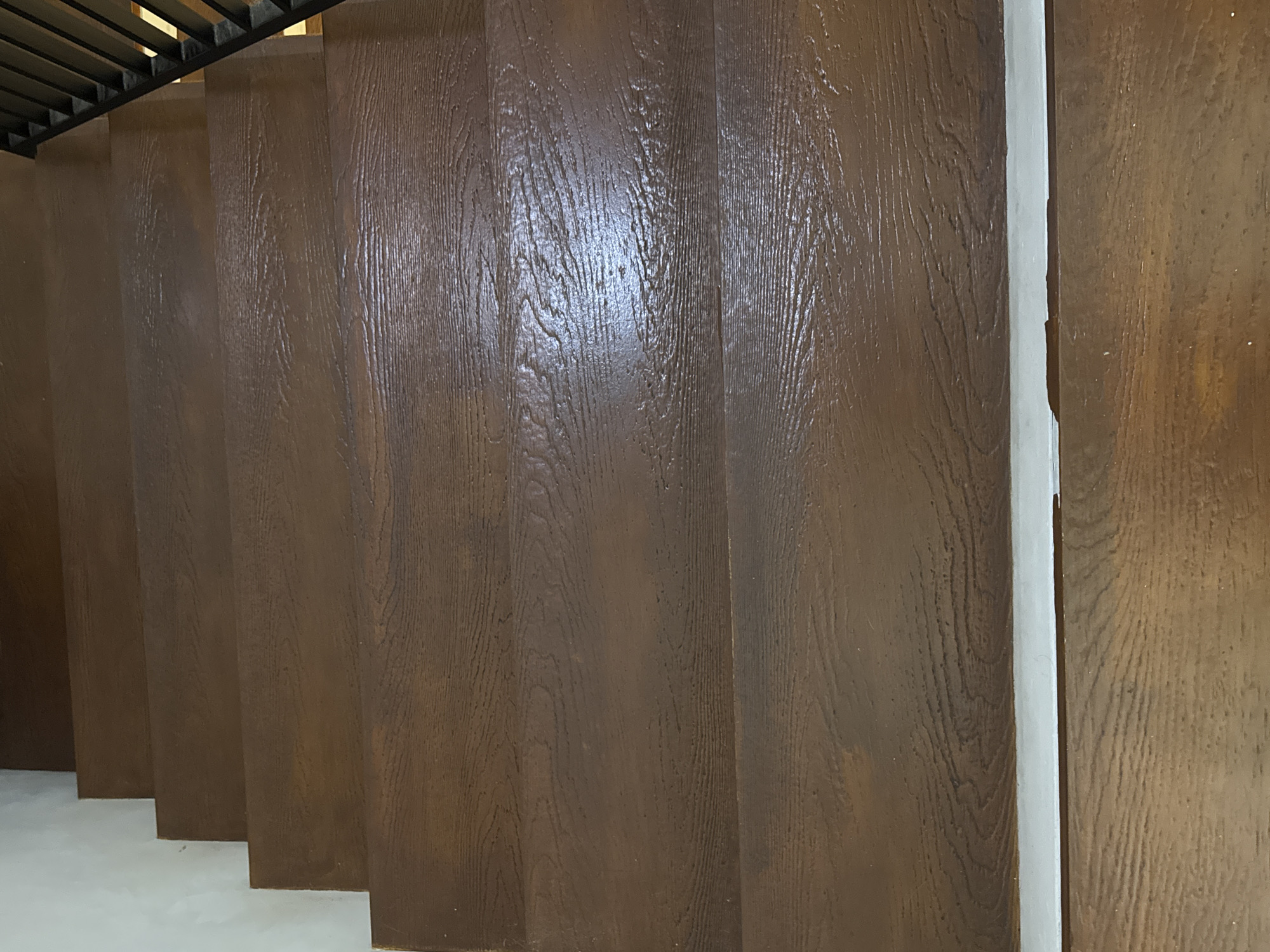 The scene depicts an interior staircase within a structure in Bekasi, Indonesia, viewed from an elevated perspective looking downwards. The stairs consist of at least seven visible dark brown treads, each featuring a simulated wood grain texture. Several treads exhibit prominent reflections, indicating an overhead or adjacent light source. The risers separating the treads and the adjacent wall on the left are uniformly off-white. A partial black metal railing, characterized by vertical balusters, is visible along the right edge of the upper section of the staircase. A slight irregularity, appearing as small dark fissures, is observable where the lowest visible riser meets its tread. No individuals, animals, or dynamic actions are present within the frame.