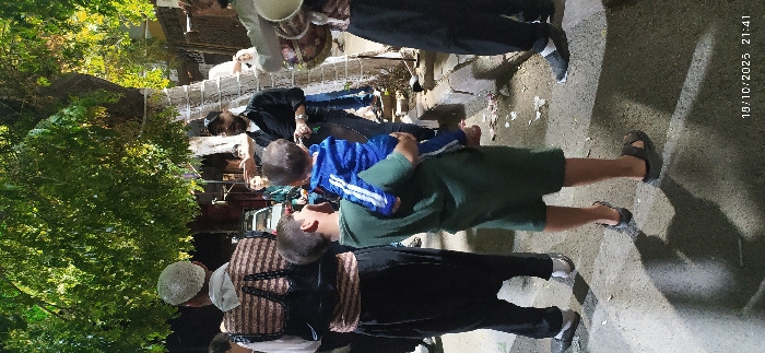 This image depicts an outdoor evening scene in Al-Kiswa, Syria, captured at 21:41 on October 18, 2023. The setting is a paved urban area, possibly a street or plaza, illuminated by artificial light sources that cast significant shadows. In the foreground, a young boy, wearing a dark green short-sleeved shirt and dark green shorts with dark sandals, is holding a smaller child. The smaller child, dressed in a blue tracksuit with white stripes on the sleeves and legs, faces away from the camera, looking towards the midground. To the left, a person is seen from the back, wearing a white knitted cap, a white shirt, a dark vest with a horizontal striped pattern (brown and lighter color), and dark pants with a patterned waist sash. White socks and light-colored shoes are visible. To the right, another person, partially visible, is wearing dark pants and dark shoes, holding a light-colored object that appears to be part of a drum or a similar musical instrument. This individual also has a striped waist sash. In the midground, slightly to the right of center, a man with a dark beard and a dark cap is visible, wearing a black shirt and dark pants. He is looking towards the left and appears to be gesturing with his right hand. Several other individuals are present in the background, some indistinct due to lighting conditions. One person in the far background-right appears to wear a white head covering. The scene is dominated by overhead tree foliage, vibrant green under the artificial lighting, which casts dappled light and dark shadows on the ground. A tree trunk on the right is partially wrapped with a white or silver reflective material. The ground is a concrete or asphalt surface, and a concrete curb delineates a slightly raised area to the right, where some scattered debris or paper is visible. A light-colored vehicle is partially visible in the mid-background-left.