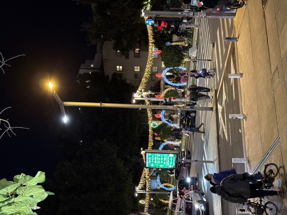 A nighttime street scene showcases festive decorations, including illuminated garlands and circular lights