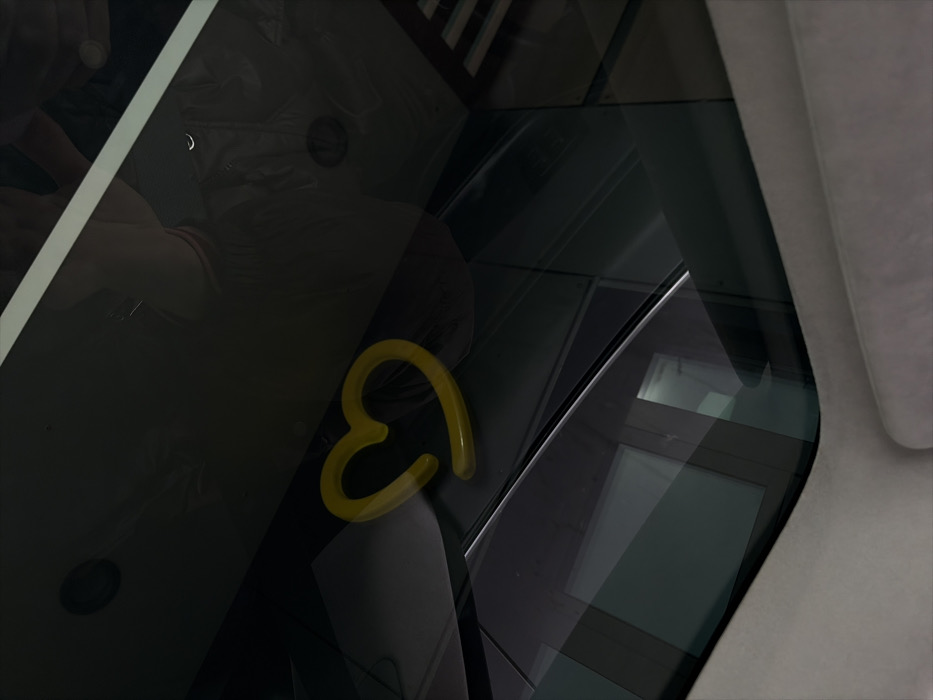 The image presents an upward-angled view through multiple transparent surfaces, likely glass, from an interior perspective. A prominent, translucent yellow heart-shaped object rests on one of these surfaces, positioned centrally in the upper half of the frame. Reflections are heavily integrated into the scene; an inverted partial reflection of a human figure, showing a light-colored arm or shoulder, is visible in the upper central portion. Through and reflected in the glass, dark, geometric structural elements are discernible, suggesting interior architecture such as ceiling panels, window frames, or distant building features. The foreground and lower right edge display a light gray, textured surface, possibly upholstery from a seat or interior panel. The specific location within the city of Hrodna, Belarus, is not visually identifiable from the image content.