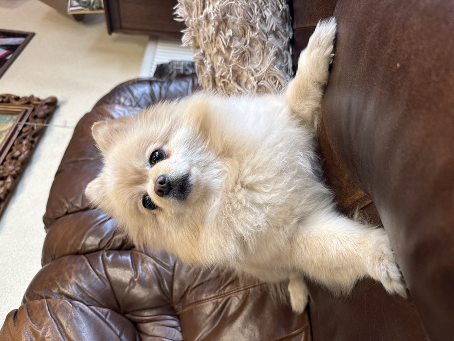 - "A light-cream Pomeranian dog occupies the central foreground, resting on a brown tufted leather couch" by FM-CCOQt1, licensed under CC BY 4.0
