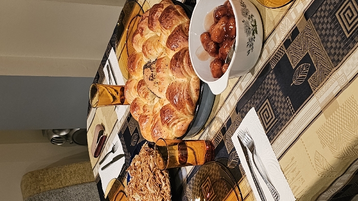 This image presents an indoor scene, specifically a dining table set for a meal, likely in an apartment or house located within the city of Varna, Bulgaria. The specific address or area within Varna cannot be determined from the visual information provided. The table is covered with a patterned tablecloth featuring alternating stripes of beige and dark brown, adorned with geometric shapes and stylized leaf motifs. Central to the composition is a large, round, baked bread, golden-brown and glossy, formed from individual rolls, some topped with black seeds, contained within a dark blue baking pan. To the right of the bread, a white oval ceramic bowl with small handles contains numerous small, reddish-brown items, resembling glazed sausages or pastries, partially submerged in a light-colored liquid. A spoon is visible within this bowl. To the left of the bread, a dark-colored plate holds a mound of thin, crispy, fried strands, possibly noodles or a type of fried dough. Two amber-colored drinking glasses, each containing a clear liquid, are positioned on the table; one near the crispy strands and another further back. Multiple place settings are indicated by partially visible plates, one brown-patterned on the far left and another beige-patterned on the far right. Silverware, consisting of forks and knives, rests on white paper napkins at different points on the table. A small, pinkish-brown, oblong case with a curved lid is situated behind one of the glasses. In the background, a dining chair with a textured, multi-toned fabric upholstery (grey and mustard yellow) is partially visible on the left. Beyond the table, a light-colored wall extends, with a section of a grey wall or partition also visible on the left. Part of a metallic-silver electronic device, possibly a speaker or appliance, is visible in the background between the chair and the wall section. No individuals are present in the frame, and no specific actions or interactions are depicted. The scene suggests a prepared meal awaiting consumption.