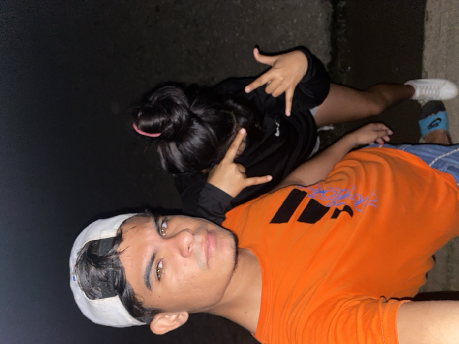A selfie-style photo shows two people. One person is lying down wearing an orange shirt with black stripes and a white baseball cap. The other person is kneeling, wearing a black long-sleeved shirt. They both have dark hair. The kneeling person is making a hand gesture with both hands. The background is dark, suggesting it was taken at night. The kneeling person is mostly out of focus, with their head partially cropped out of the frame.