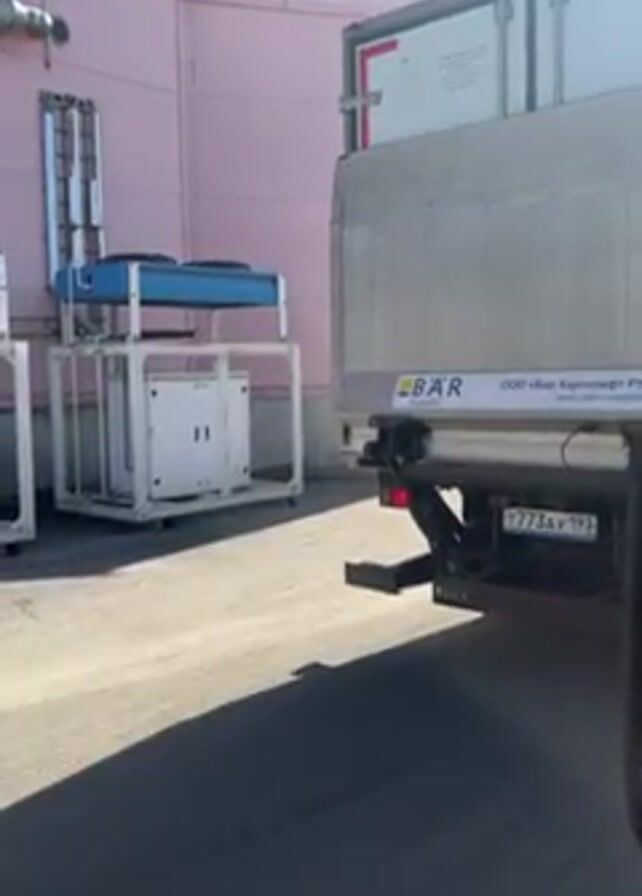 truck's liftgate lowering. The truck is white and has a BÄR liftgate. The license plate is T773AY 193. The truck has an advertisement on the side for “Sirius” bread. The video is taken during the daytime in an outdoor setting on an asphalt surface. A pink building can be seen in the background next to two white machines.
