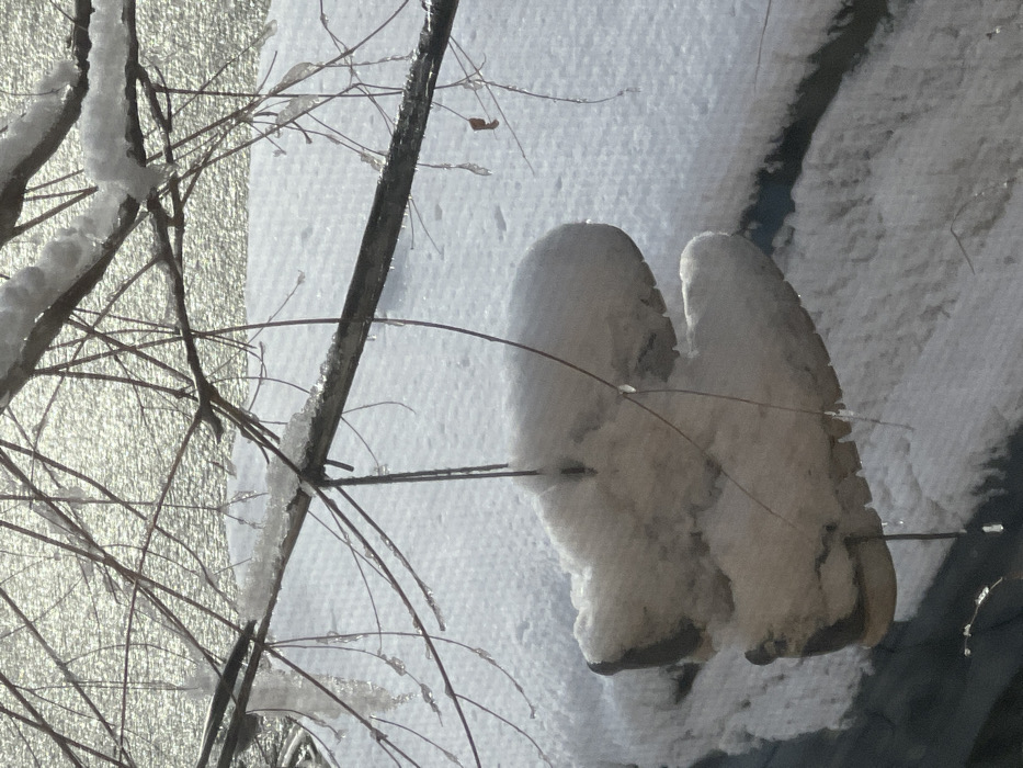 Snow-covered branches frame the left of the image. Adjacent to the branches, an expanse of white snow stretches toward the background. Partially obscured by delicate, snow-dusted twigs is an object with a distinctive shape; it appears as two upright ovals fused together, suggesting a footwear such as snow boots, thickly covered in snow. The texture implies heavy snowfall clinging to the landscape.