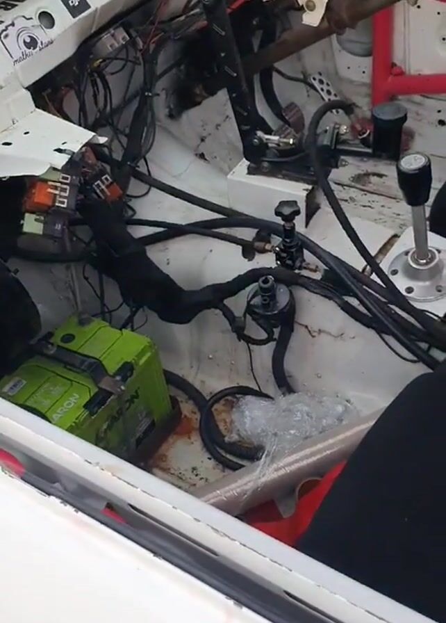 interior of a modified car, possibly a race car, with various components visible. The interior is white, and there's a roll cage painted pink. There are two black bucket seats with red trim, and a standard manual gear shift lever. A green car battery is visible on the floor, along with extensive wiring and other mechanical components. In the back, secured by red straps, are two red fuel cans, and an aftermarket fuel cell and fuel filter.