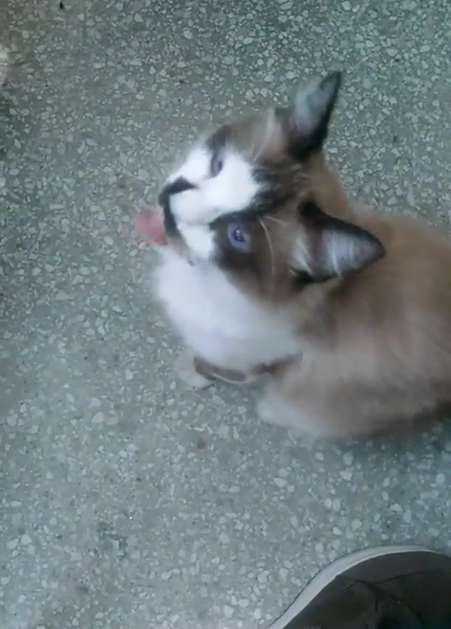 cat with white, brown, and black fur, and blue eyes. The cat is sitting on a gray, speckled surface. The cat is looking up and sticking its tongue out. A person's leg and brown shoe are visible in the bottom right corner of the video. The cat continues to stick its tongue out.