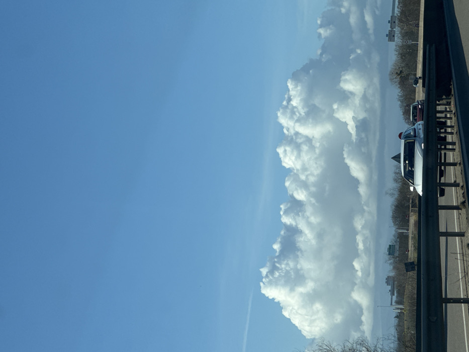 The image displays a daytime exterior scene, likely captured from a moving vehicle on a multi-lane highway in Illkirch-Graffenstaden, France. A silver-colored metal guardrail occupies the lower foreground, extending horizontally across the frame, with a shadowed area beneath it. On the visible asphalt roadway, a light-colored Audi Q5 SUV is positioned in the right mid-ground, traveling away from the camera. A darker vehicle is partially visible behind the Audi. The background features a band of bare deciduous trees and brush. Beyond the vegetation, various structures are present, including overhead highway gantry signs on both the left and right, and several multi-story buildings with flat roofs situated to the left of center. The upper two-thirds of the image consist of a clear blue sky, dominated by a large, horizontally extended formation of dense, white cumulus clouds above the horizon. A faint, linear cloud trail is visible in the upper left quadrant of the sky. No people are visible.