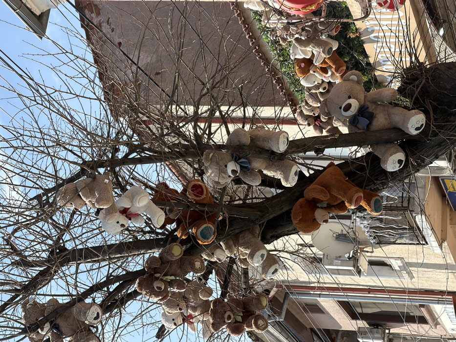 The image depicts a deciduous tree in Krichim, Bulgaria, with numerous teddy bears affixed to its bare branches and trunk